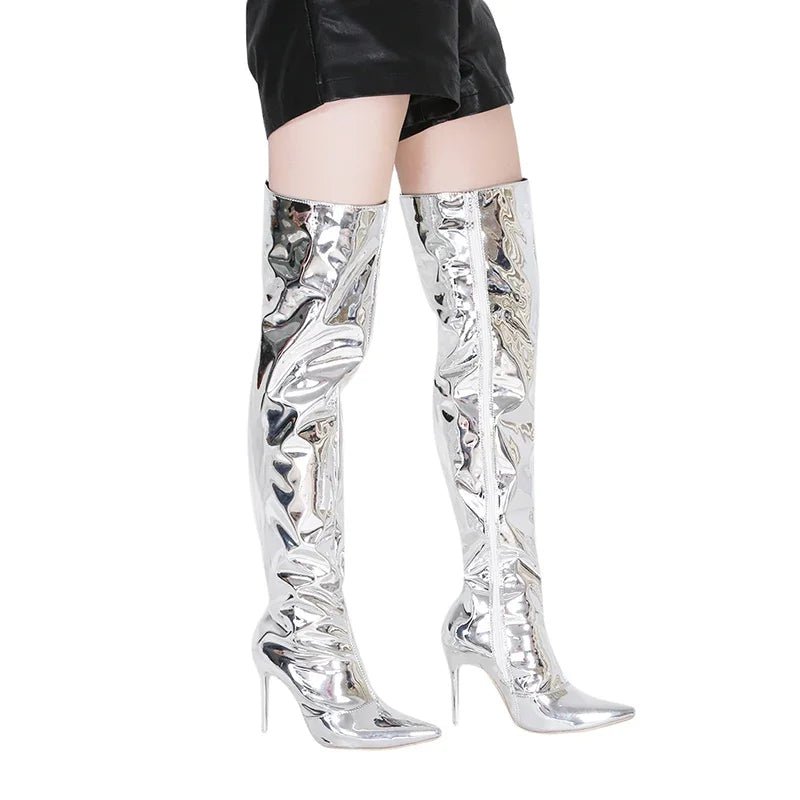 Bottes Hautes Sexy Argentées Effet Miroir Femme – Bout Pointu – Soirée Club & Boîte de Nuit