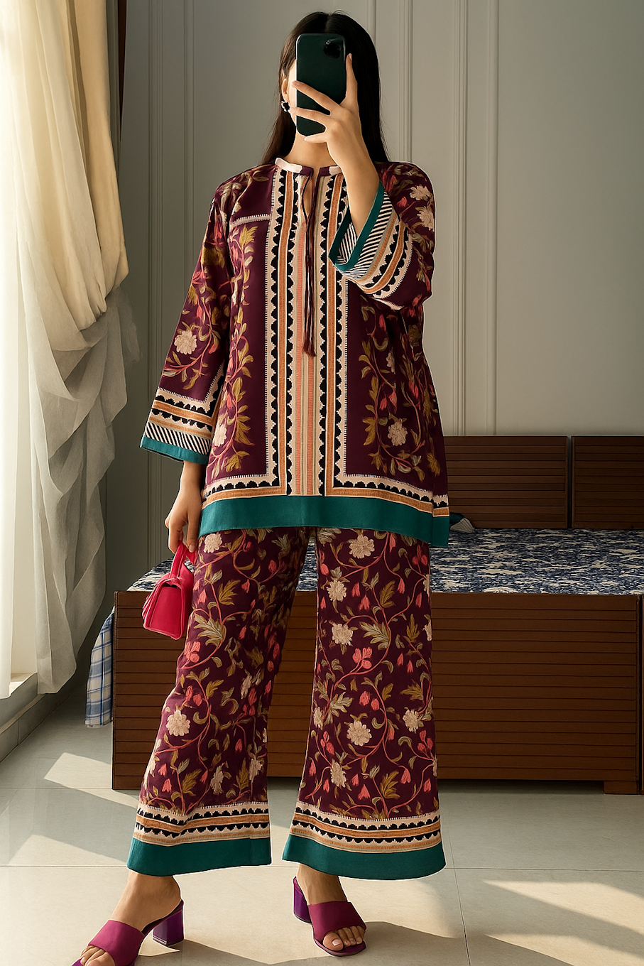 Ensemble Coordonné Floral Marron avec Bordure Contrastée – Kurta et Pantalon Droit